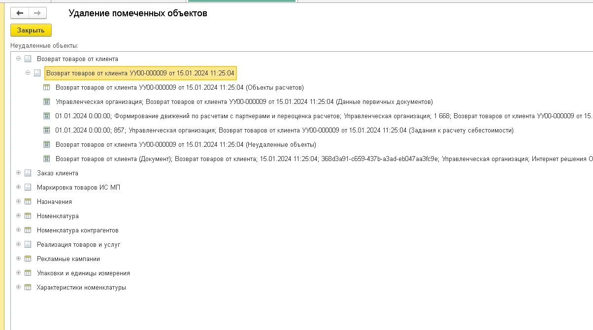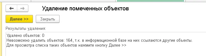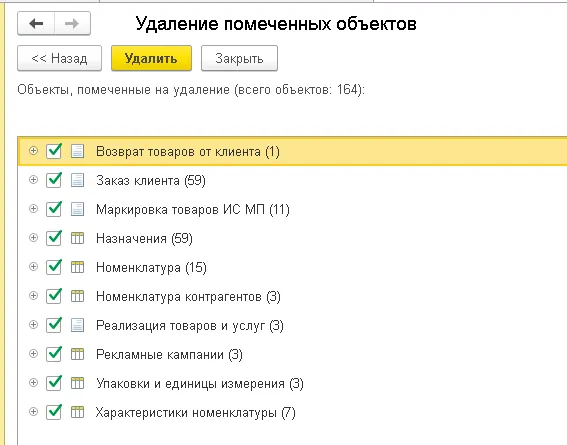 Удаление можно выполнять сразу для все базы 1С или по выбранным объктам метаданных.