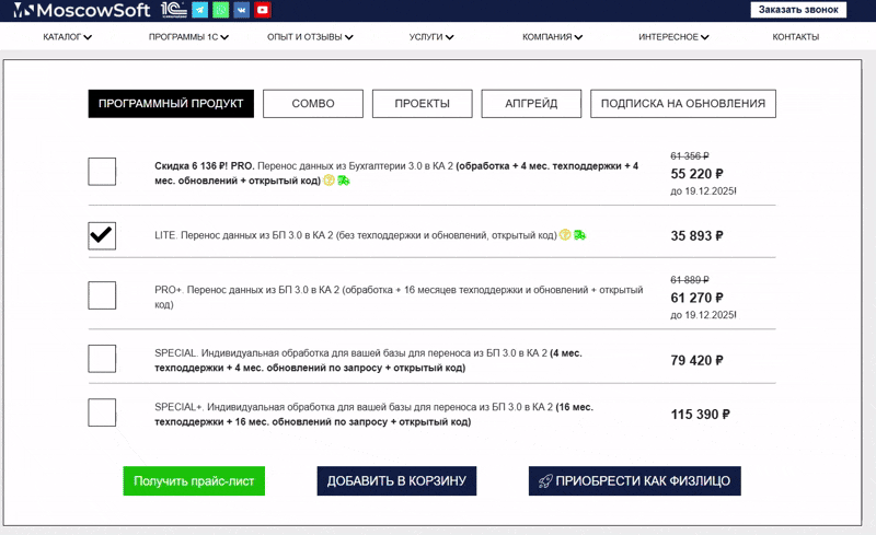 LITE - предоставляется комплект переноса, содержащий актуальные правила для перехода между последними релизами программ 1С, также архив правил для старых релизов, инструкция и нетиповая обработка для выполнения переноса (в нее добавлен дополнительный функционал и исправлены ошибки). Перенос выполняется самостоятельно. В случае возникновения критических ошибок оперативно их исправляем. Консультации не предоставляются. Обновления переноса не предоставляются. Есть возможность апгрейда до тарифа PRO.