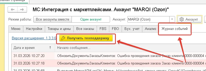 Чаще всего мы получаем запросы на техподдержку по таким обращениям, как “не создаются заказы в 1С” или “не отправляются остатки по схеме FBS на маркетплейс”. Для того, чтобы специалисты техподдержки компании MoscowSoft смогли увидеть все настройки модуля и тексты ошибок из журнала событий нужно отправить нам техническую информацию.