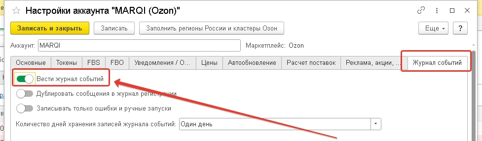 - Если в списке журнала событий пусто, значит для текущего аккаунта ведение журнала отключено. Необходимо включить, подождать, пока в журнале появятся сообщения с ошибками и только после этого создавать обращение в техподдержку. Зайдите в настройки аккаунта и включите ведение журнала событий на вкладке Журнал событий: