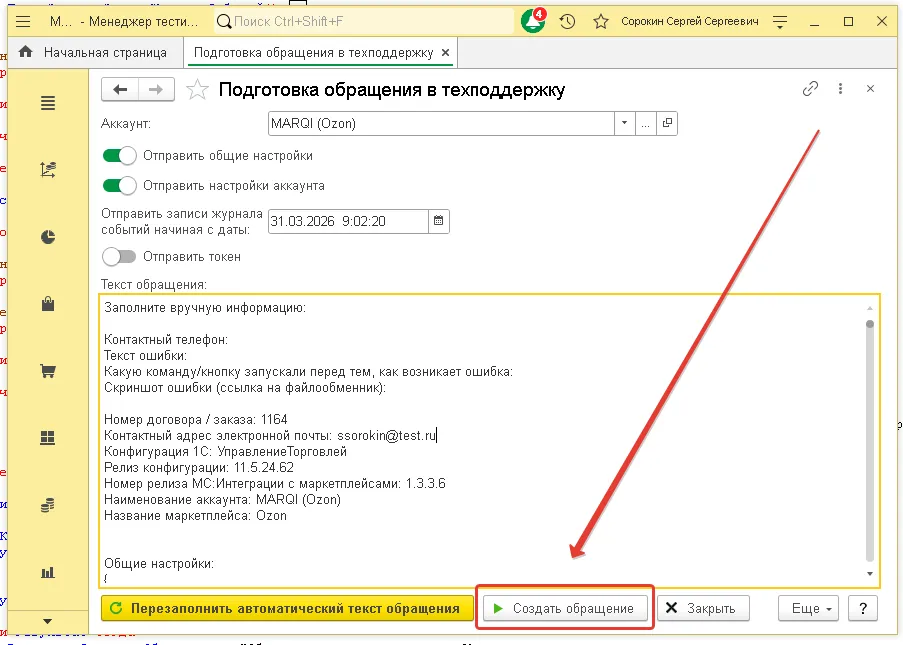 Как это сделано, рассказали ниже по тексту. Отправка такого обращения займет у вас буквально несколько кликов мыши. При этом не придется самостоятельно делать скриншоты настроек модуля для интеграции 1С с маркетплейсами. Специалист MoscowSoft сможет оперативно изучить ваши настройки без удаленного подключения к вашему компьютеру с базой 1С. Таким образом, исправление замечаний и получение помощи произойдут гораздо быстрее, если вы отправите обращение из модуля.
