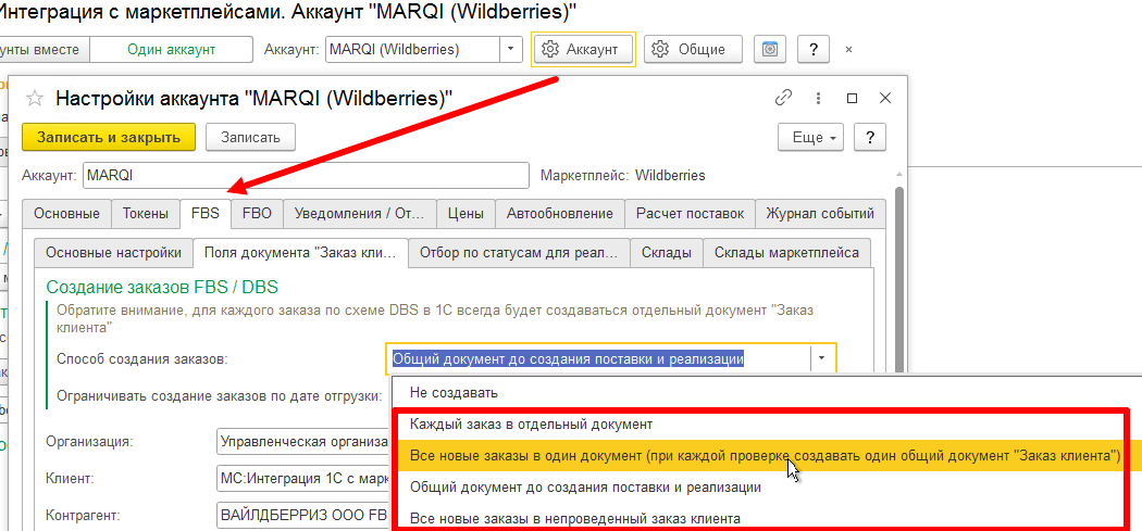 - Далее нужно в настройках аккаунта выбрать удобный для вас способ создания документа "Заказ клиента". Доступны следующие варианты - "Общий документа до создания поставки и реализации" (это значение по умолчанию), "Все новые заказы в один документ" (при каждой проверке создавать документ "Заказ клиента"), "Каждый заказ в отдельный документ", "Не создавать".