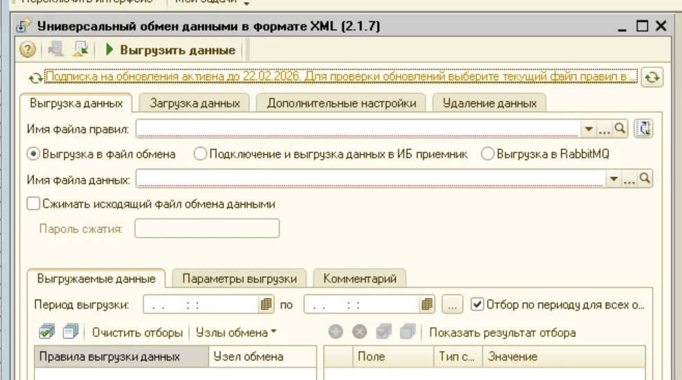 - Если вы запускаете выгрузку только изменённых объектов, изучите стандартную возможность обработки Универсальный обмен… выгружать только те объекты, которые зарегистрированы к изменению на узле плана обмена. Читайте инструкцию в отдельной статье.