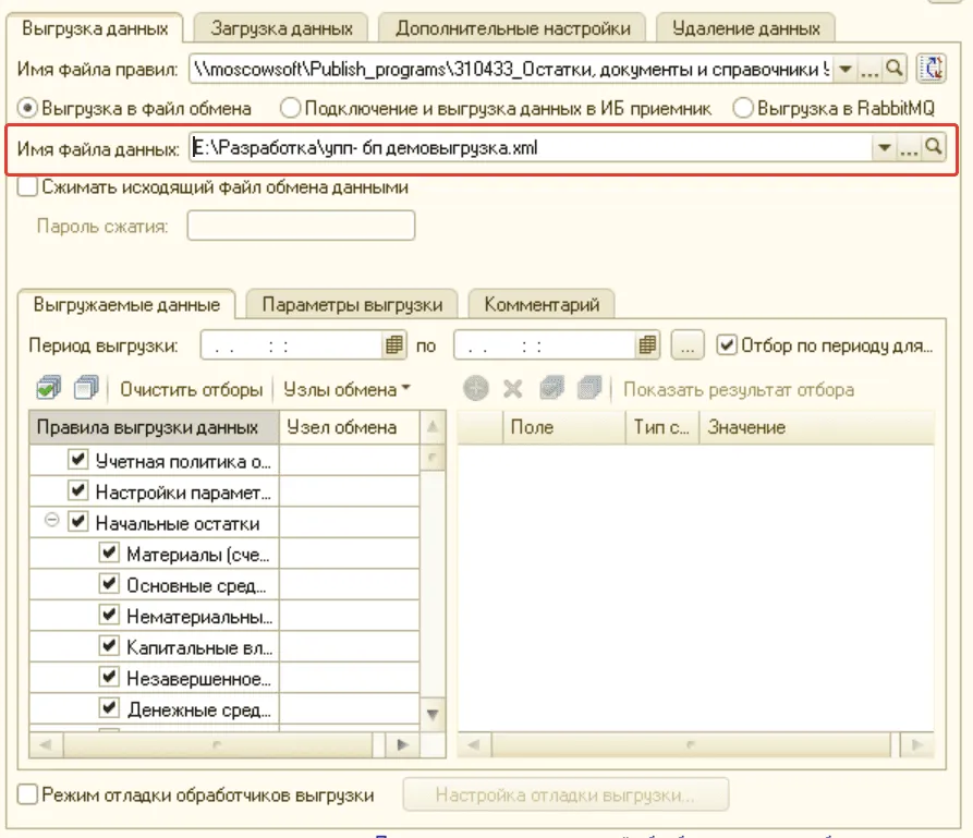 Укажите путь на диске, куда будут сохраняться данные выгрузки — выберите путь в поле Имя файла данных. Рекомендуем выбирать именно вариант выгрузки в файл, хотя бы на первых итерациях выгрузки данных. Уже в будущем для выгрузки новых объектов, при желании, можете использовать СОМ-подключение в обработке Универсальный обмен. Выгрузка в файл позволяет увидеть в логах максимум сообщений об ошибках.