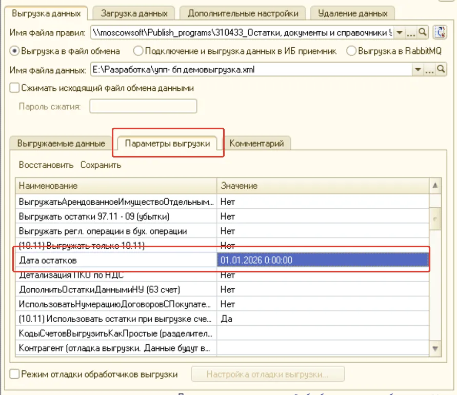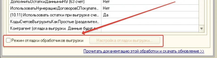 - Если вы — специалист 1С и занимаетесь отладкой правил переноса, в некоторых случаях полезным будет включить Режим отладки обработчиков выгрузки. Как запустить отладку обработчиков событий, описано подробно в отдельной статье.