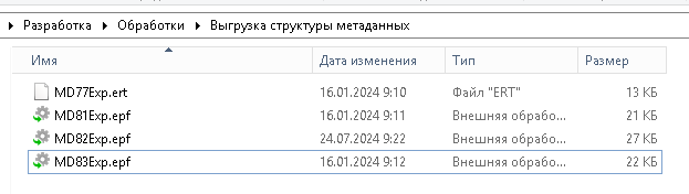 Скачайте сразу четыре версии обработки для разных версий платформы 1С: md77exp.ert, md81exp.epf, md82exp.epf, md83exp.epf: