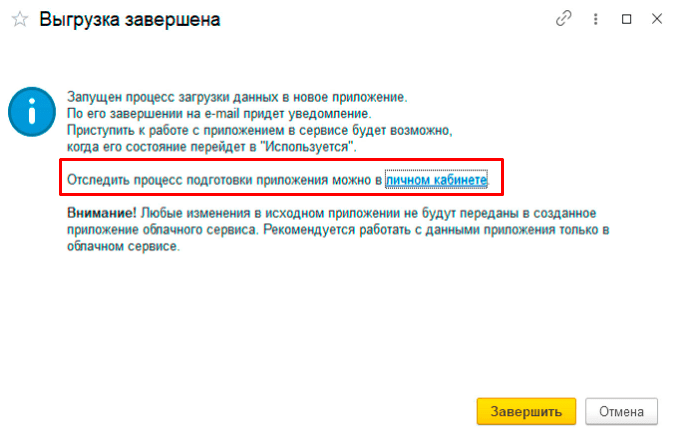 Когда закончится выгрузка, система сообщит об этом. Как и о том, что запускается процесс загрузки данных в новое приложение. Предлагается отслеживание процесса подготовки приложения в личном кабинете. Особое внимание обращается на то, что любые изменения в исходном приложении не передаются в новое приложение облачного сервиса.