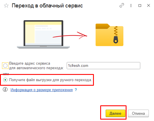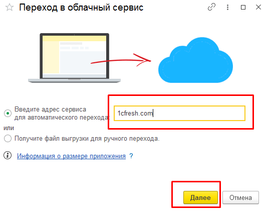 Откройте форму помощника перехода в облачный сервис. Отметьте строку для автоматического перехода и пропишите адрес сервиса 1cfresh.com. После этого щелкните на Далее.