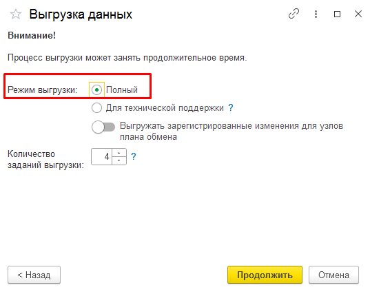 В большинстве случаев принято выбирать режим выгрузки «Полный». Другой вариант, который мы видим на картинке 13, называется «Для технической поддержки». Он используется, когда требуется тестирование или разбор проблем.