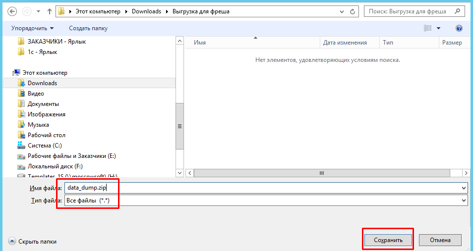 После завершения процесса в обычном режиме выгрузки (Полный) сохраняемому файлу по умолчанию присваивается имя «data_dump.zip». А также надо указать каталог, в котором следует сохранить новый файл на компьютере. И, естественно, отдать команду о сохранении.