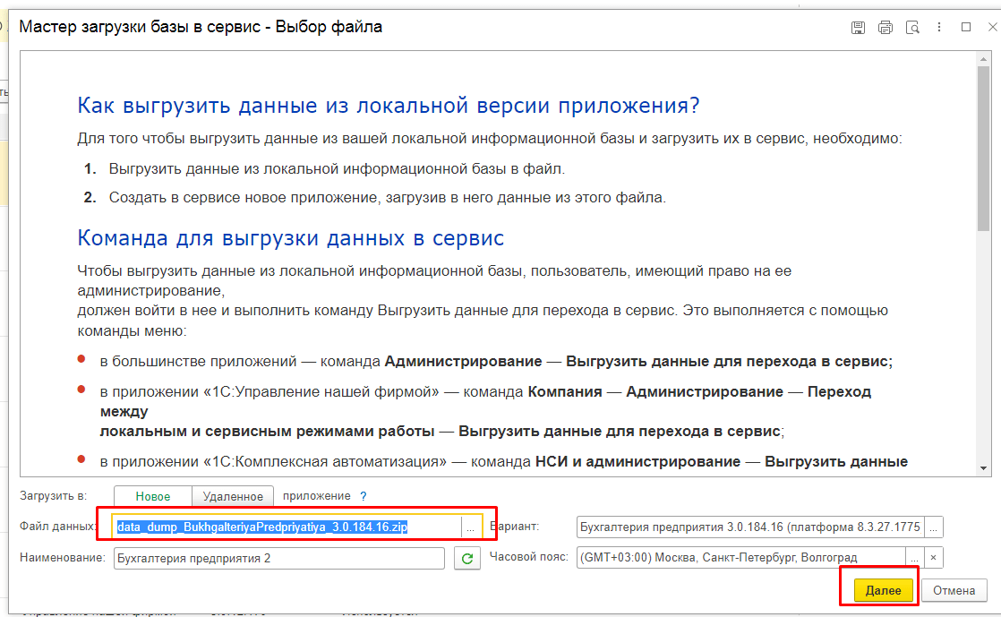 Кнопка |…| в строке Файл данных также вам понадобится. Нажимайте ее и перетаскивайте файл, выгруженный ранее из локальной информационной базы, в открывшееся окно. После нажатия кнопки ОК будет выполнена загрузка и анализ файла, при котором сервис определит конфигурацию приложения, вариант приложения. При необходимости можно изменить в соответствующем поле наименование вашего приложения и нажать кнопку Далее.