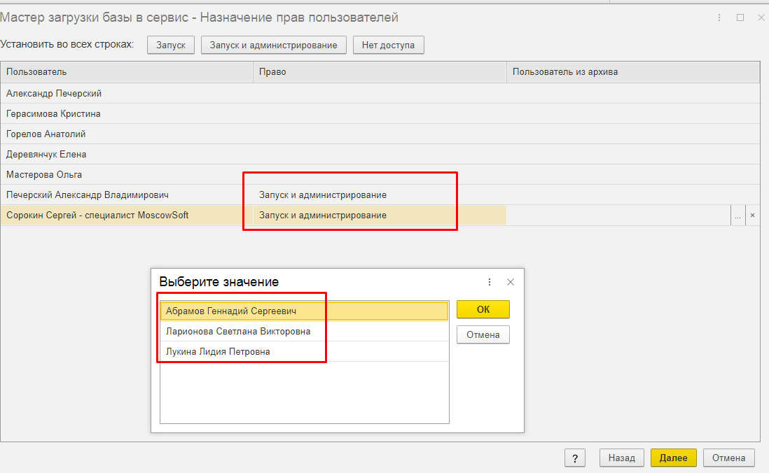Открываем следующее окно менеджера «Мастер загрузки базы в сервис». Здесь предстоит назначить права пользователям. На скриншоте 19 слева в колонке находится список пользователей из локальной ИБ. Выбираем нужного и сопоставляем с пользователями сервиса.