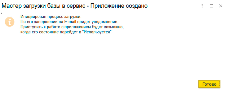 Менеджер «Мастер загрузки базы в сервис» сообщит, когда приложение загрузится. В окне появится статус «Используется» при благополучном завершении процесса. Либо «Ошибка подготовки», если таковая возникнет. На указанную почту отправится сообщение о завершении.