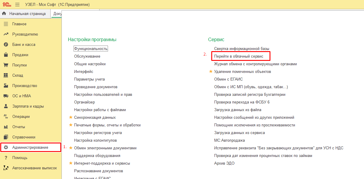 Чтобы найти команду, надо открыть меню Начальной страницы, найти в нем Администрирование. В открывшейся форме раздел Сервис, в котором есть пункт «Перейти в облачный сервис».