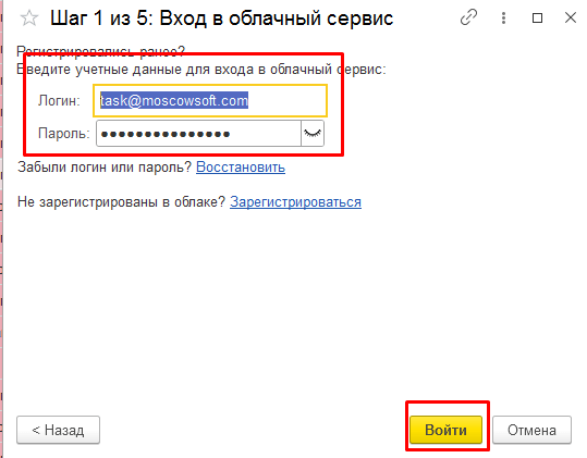 В открывшемся окне надо авторизоваться в личном кабинете облачного сервиса 1С: Фреш. Введя логин и пароль, нажать Войти.