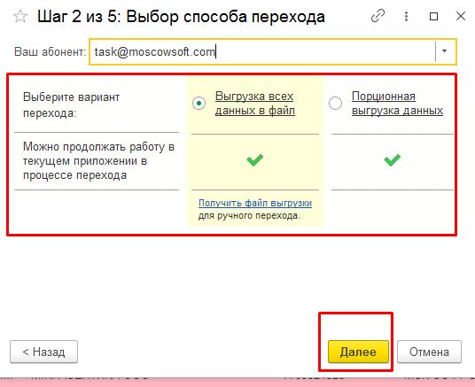Для выгрузки данных из локальной информационной базы в файл с последующей загрузкой в облачное решение предусмотрено два способа: автоматически и вручную. Мы можем выбрать подходящий вариант в форме помощника перехода в облачный сервис. Ориентируемся при этом на стабильность интернета — важное условие для автоматической загрузки, рассчитанной на продолжительное время. Иначе придется файл выгрузки загружать ручным способом, отведя на эту процедуру побольше времени.
