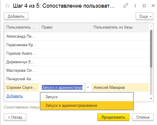 То есть в колонке «Право» указываем «Запуск» либо «Запуск и администрирование». В третьей колонке «Пользователь из архива» надо нажать на значок |…|. В выпавшем списке устанавливается соответствие между пользователями аккаунта и теми, кто указан в загружаемом файле.
