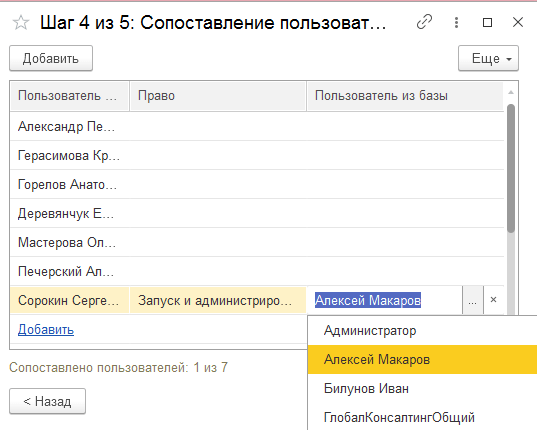 Еще одно действие, которое следует совершить в том же окне после нажатия на кнопку Продолжить. В колонке Пользователь из базы выпадает список с именами. Здесь надо выбрать Имя, которое соответствует Пользователю сервиса. На скриншоте 7 это наш Алексей Макаров.