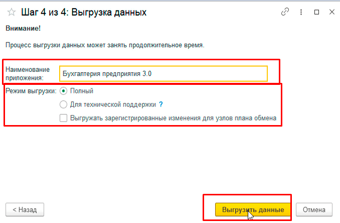 Прежде чем отдать команду о выгрузке приложения, вы можете поменять наименование приложения в одноимённой строке. Из предлагаемых трех режимов выгрузки отмечаем нужный вам вариант Полный. Свои действия подтверждаете командой Выгрузить данные.
