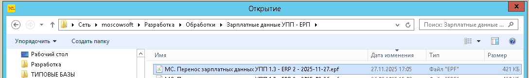 - Запустите базу 1С: УПП. В меню выберите Файл - Открыть. Найдите на диске обработку для выгрузки зарплатных данных компании MoscowSoft или фирмы 1С. Откройте ее.