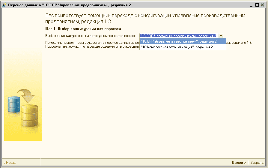 - Выберите конфигурацию, в которую будете в будущем загружать данные - ERP или КА 2.