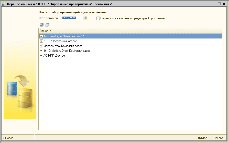 - На следующем шаге отметьте флажками организации, по которым будете выгружать зарплатные данные: