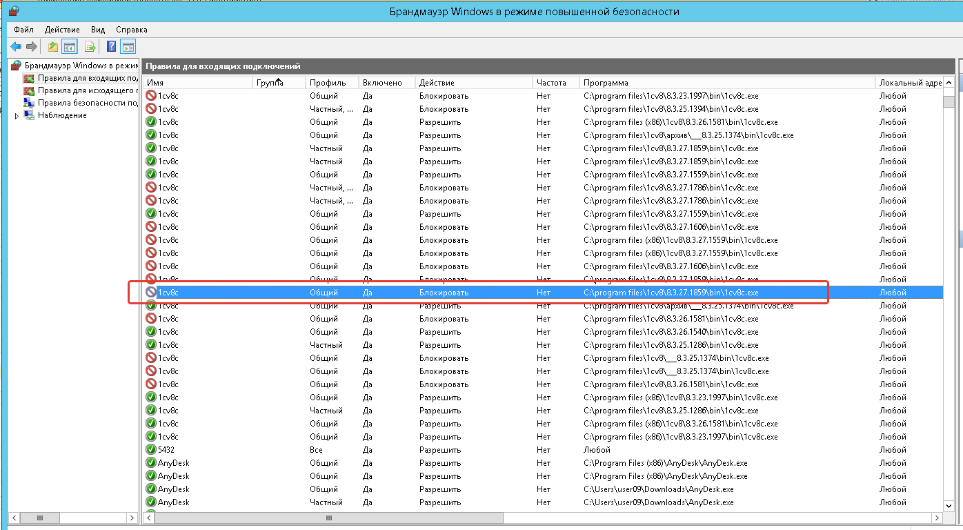 Ищем в брандмауэре. Видим в списке подозрительную запись как раз для актуальной версии платформы с типом "Блокировать":