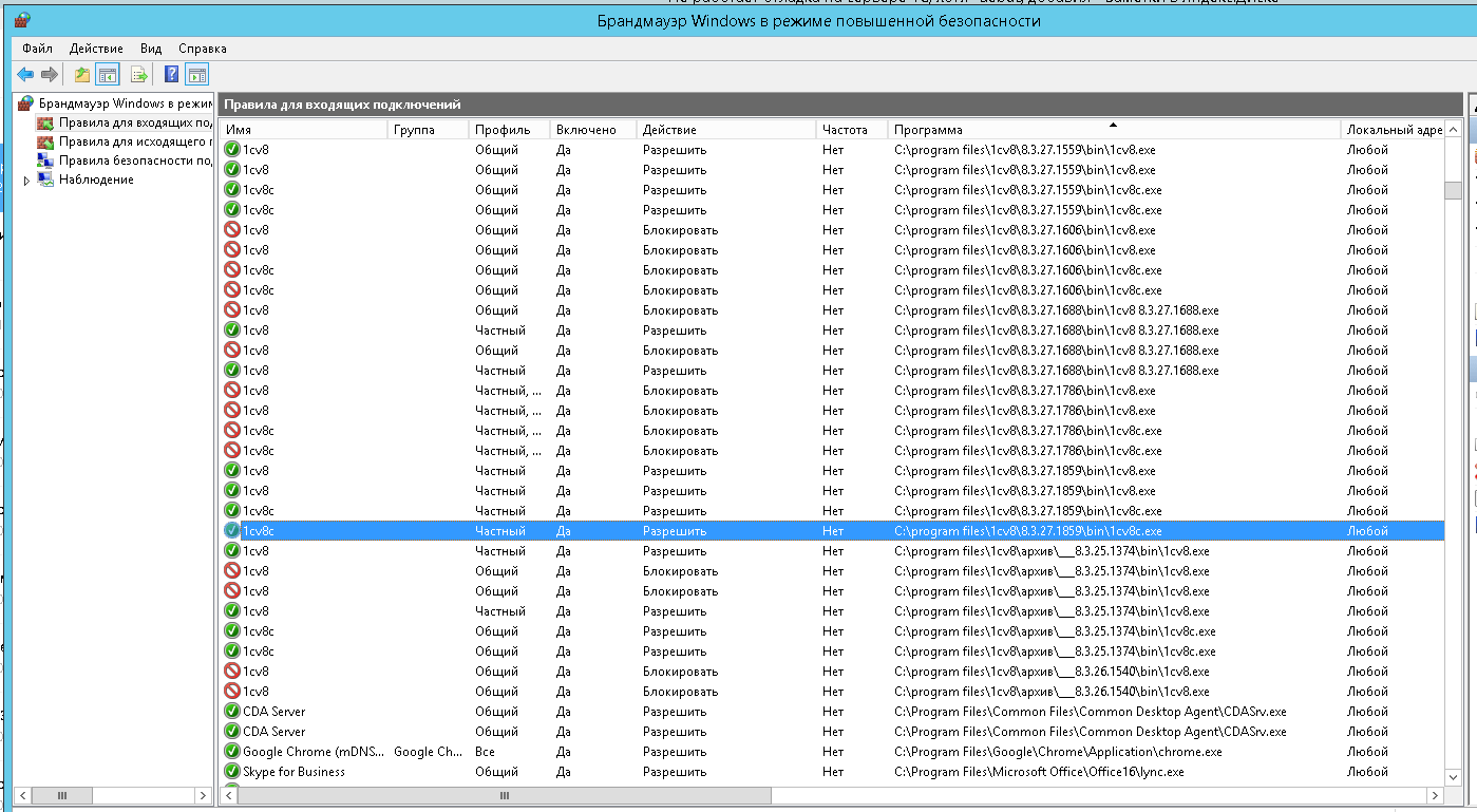 Исправление правил в брандмауэре для включения отладки на сервере 1С