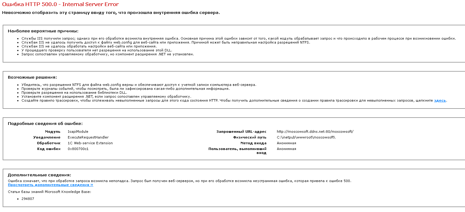 После публикации информационной базы на IIS перед пользователем на экране может отразиться надпись «Ошибка HTTP 500.0 - Internal Server Error». Не спешите пенять на неправильную работу платформы 1С и срочно связываться с технической поддержкой. Попробуйте справиться с проблемой собственными усилиями. Для этого внимательно прочитайте все, что написано на экране компьютера. Там обозначены вероятные причины, возможные решения проблемы, подробные сведения об ошибке. По указанной ссылке можно просмотреть дополнительные сведения.