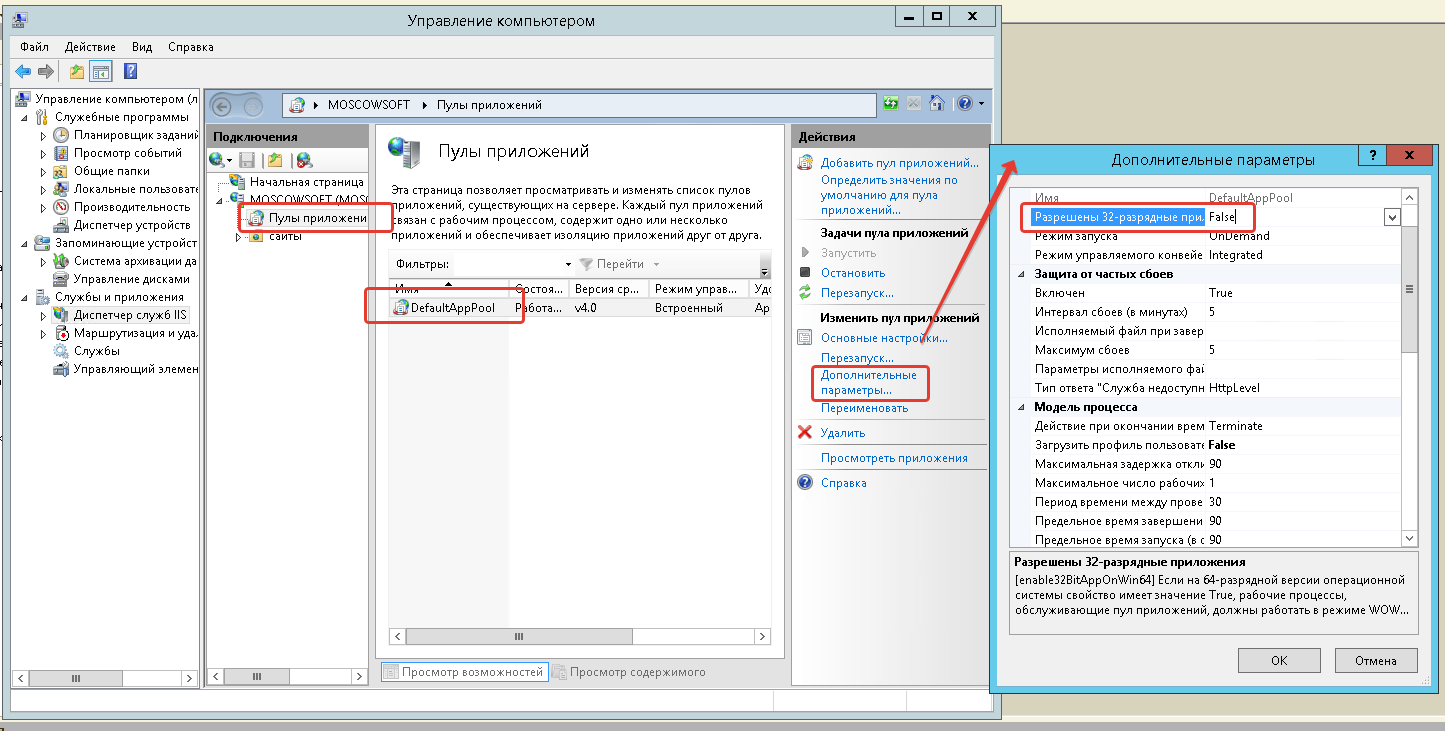 Наиболее частой причиной является установка запрета на запуск 32-разрядных приложений в настройках IIS, в 64-разрядной среде. Для устранения проблемы потребуется обратиться к Диспетчеру служб IIS в меню Управление компьютером. Выполнить некоторые элементарные действия для разрешения запуска таких приложений.