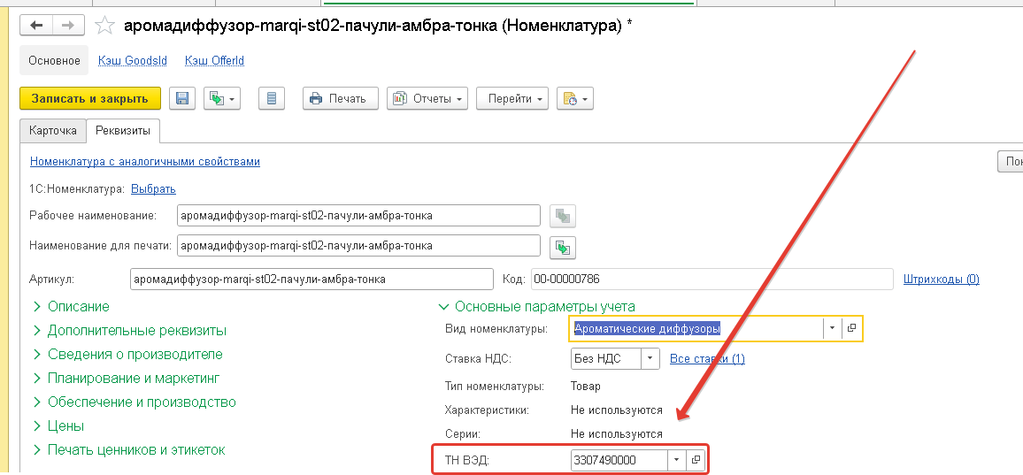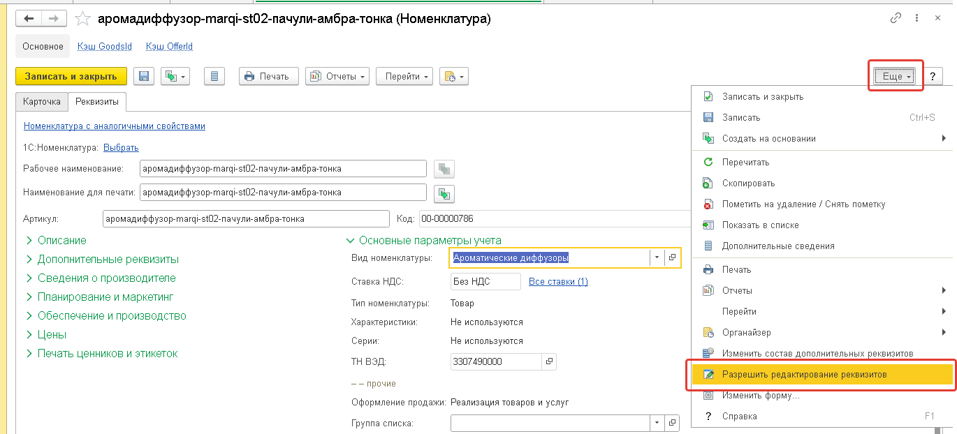 - Зайдите в справочник Номенклатура. Создайте новый элемент или разрешите редактирование существующего. Редактирование существующего включается как показано на скриншоте: