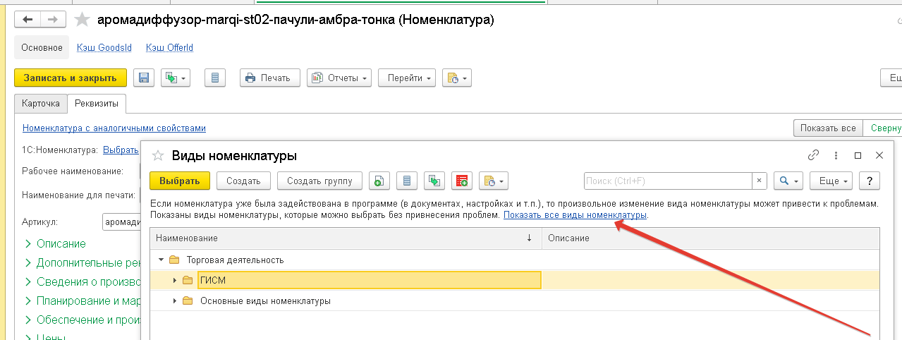 - Выберите вид номенклатуры. Если редактируете существующую номенклатуру и нужный вид номенклатуры не видите в списке, нажмите ссылку Показать все виды номенклатуры.