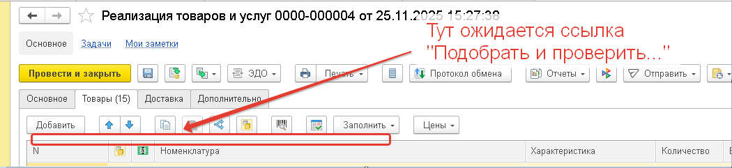 Что делать, если в документе Реализация отсутствует кнопка “Подобрать и проверить маркируемую продукцию”