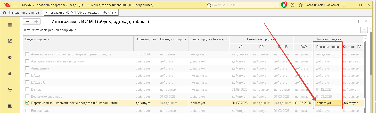 Кроме того, для хозяйственной операции, которую нужно вам выполнить с учетом маркировок, должно быть написано действует. Если установлена дата позже, просто изменить ее на более раннюю. После изменения даты в строке должна быть надпись действует, как на скриншоте: