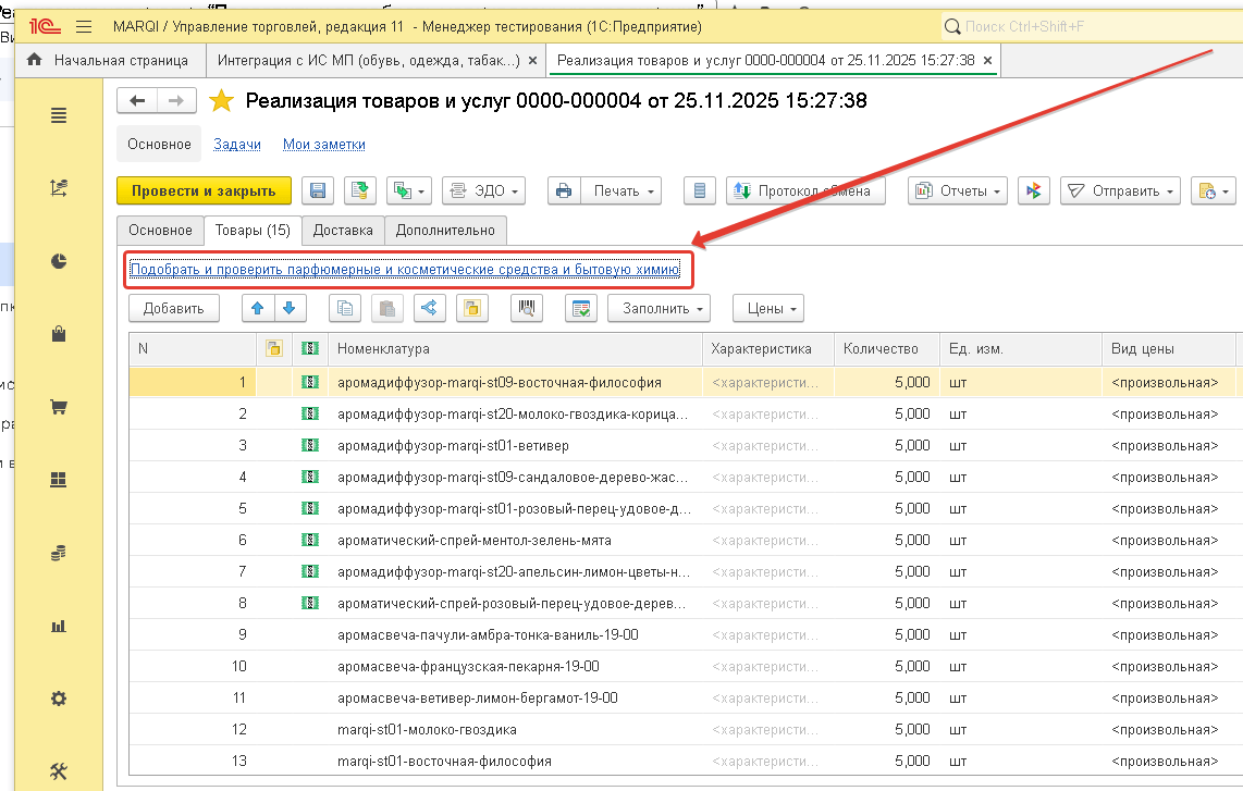 После проделанных настроек в базе 1С проверьте форму документа Реализация. Если ссылка подбора и проверки маркируемой продукции в документе Реализация не появилась, переходите к Шагу 3.