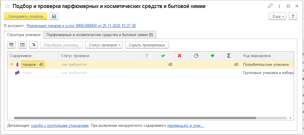 В нашем случае в форму подбора товары подбирали с помощью проводного сканера штрихкодов. Строки товаров с маркировками добавлялись в документ автоматически: