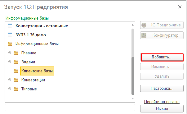 После того, как необходимая информация собрана, приступаем к процессу создания новой информационной базы. Открываем окно «Запуск 1С: Предприятия». В списке «Информационные базы» находим «Клиентские базы» и справа нажимаем команду «Добавить». Весь процесс отражен на скриншоте 1.