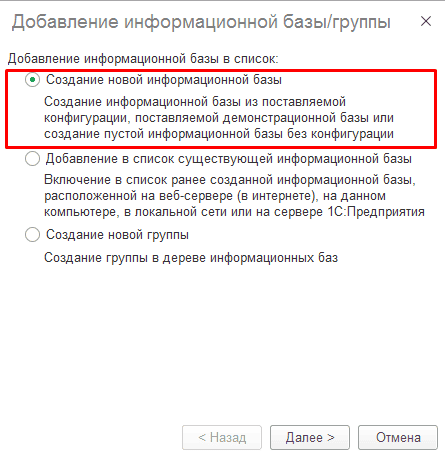 Когда откроется окно «Добавление информационной базы/группы», мы увидим три варианта (рисунок 2). Из них выбираем первый «Создание новой информационной базы», ставим отметку и нажимаем «Далее».