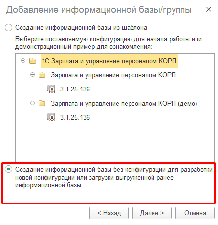 - «Создание информационной базы без конфигурации для разработки новой конфигурации или загрузки выгруженной ранее информационной базы».