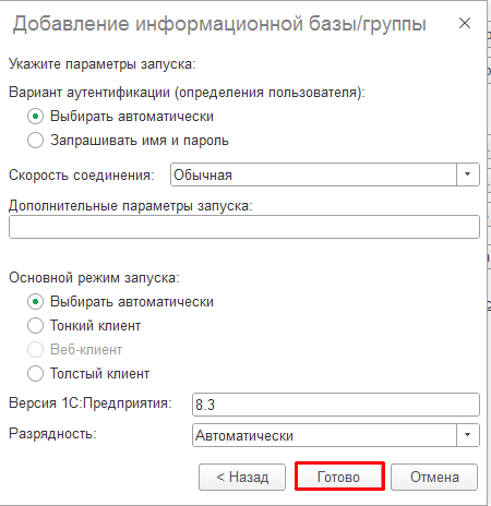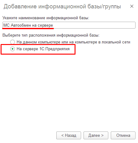 Нажимаем «Далее» и переходим к следующему этапу. Необходимо в окне «Добавление информационной базы/группы» указать все параметры ИБ:
