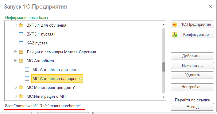 Клиент - серверная база «МС:Автообмен на сервере» есть в списке платформы «1С:Предприятие». Значит, наши усилия увенчались успехом.