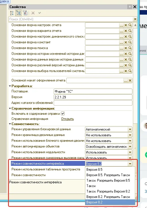 В свойствах конфигурации смотрите значение параметра Режим совместимости интерфейса. Он должен иметь одно из трех значений: Версия 8.2, Версия 8.2. Разрешить Такси или Такси. Разрешить Версия 8.2.
