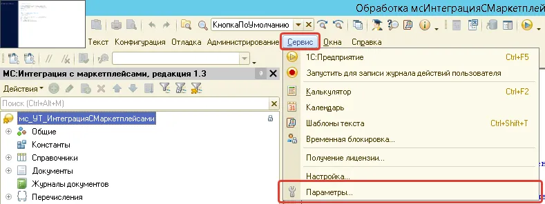 - Откройте базу в конфигураторе и зайдите в меню запуска отладки: Сервис - Параметры:
