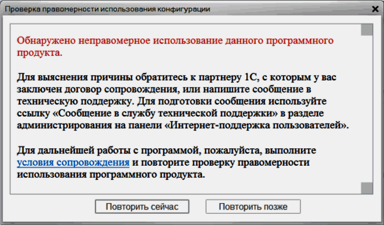 Обычно ошибка "Обнаружено неправомерное использование данного программного продукта" появляется после обновления конфигурации 1С на новый релиз.