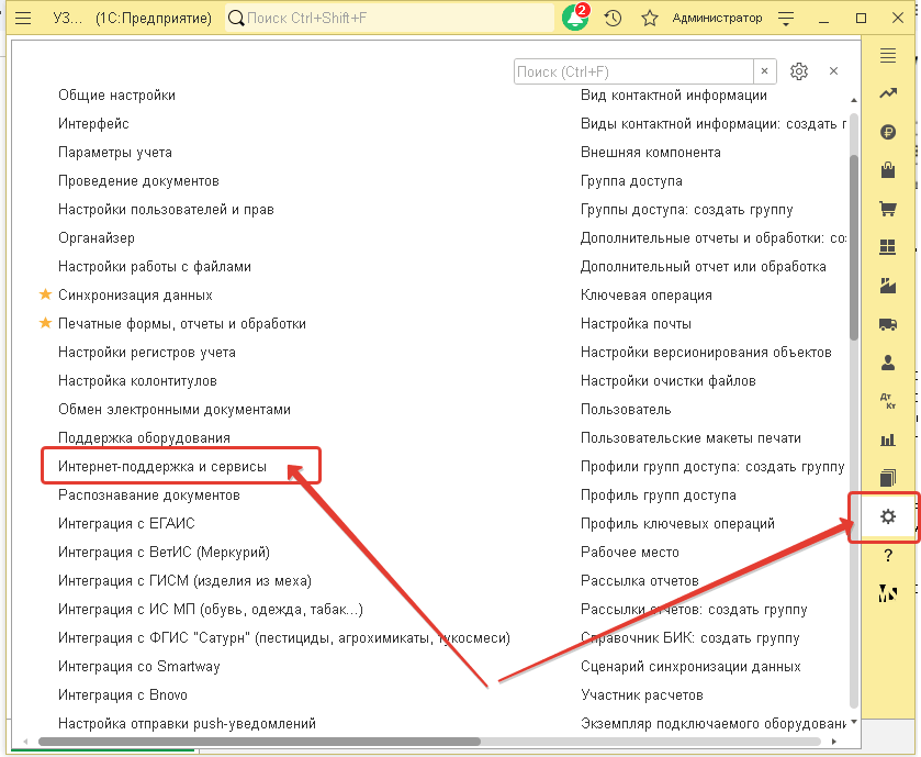 Шаг 2. Необходимо подключить интернет-поддержку в самой программе 1С