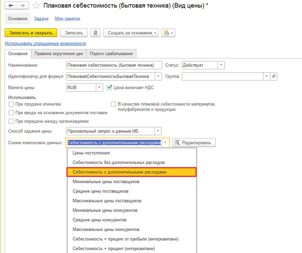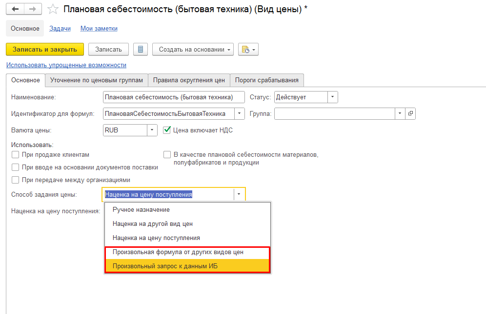 В этой публикации мы с ними не работаем. Рассматриваем только вкладку «Основное», как на скриншоте 2. В реквизите «Способ задания цены» в выпадающем списке также появились новые пункты — произвольная формула от других видов цен и произвольный запрос к данным ИБ. Для нашего примера выбираем «Произвольный запрос к данным ИБ».