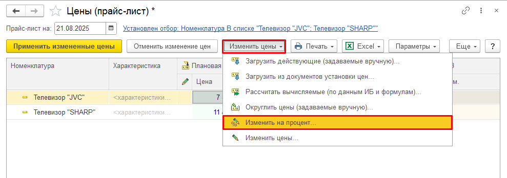 - Расчет увеличения цены на пять процентов в рабочем месте «Цены (прайс - лист)».