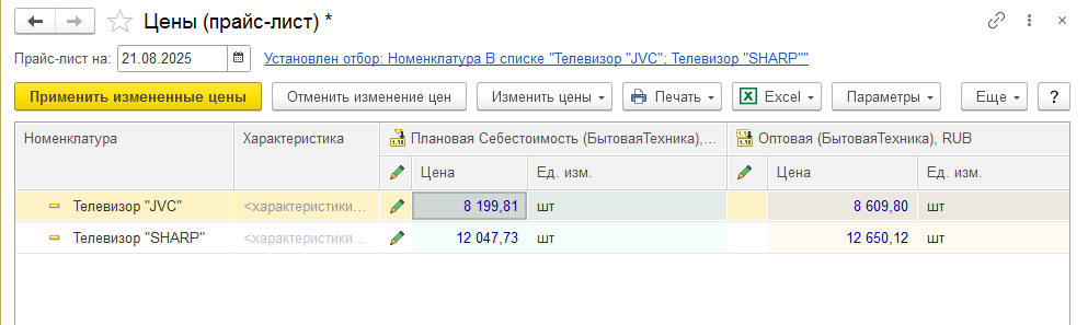 Итак, рассмотрим решение задачи по отражению в конфигурации плановой себестоимости определенных товаров в качестве вида цен для дальнейшего автоматического расчета. А именно, нас интересует бытовая техника: телевизоры JVC, SHARP.